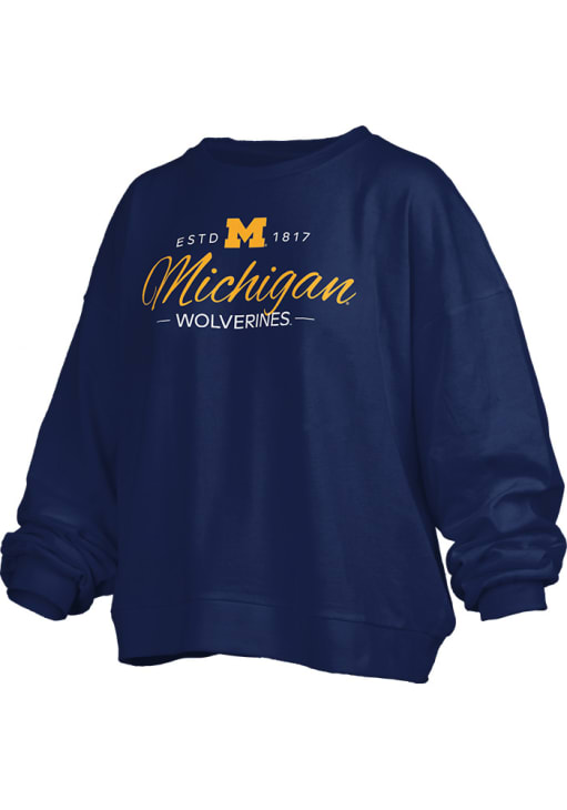 Gear up for the ultimate game day experience with this remarkable Michigan WolverinesWomens Navy Blue Alexus Script Crew Sweatshirt! Designed with the true fan in mind, this Wolverines Long Sleeve Sweatshirt features a screen print team name and logo on center chest. Stay warm and comfortable with this Womens Michigan Wolverines Crew Sweatshirt.