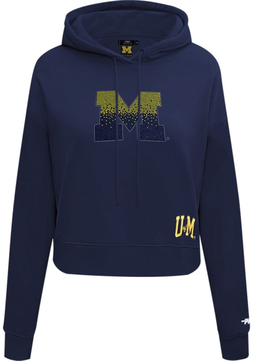 Embrace your Wolverines pride and showcase your team spirit with confidence in this Michigan Wolverines Long Sleeve Hoodie! Stay warm and stylish with the Michigan Womens Blue Jewels Hooded Sweatshirt. Designed with rhinestone team name and logo on center chest, this Wolverines Long Sleeve Hoodie is a must-have for dedicated fans.