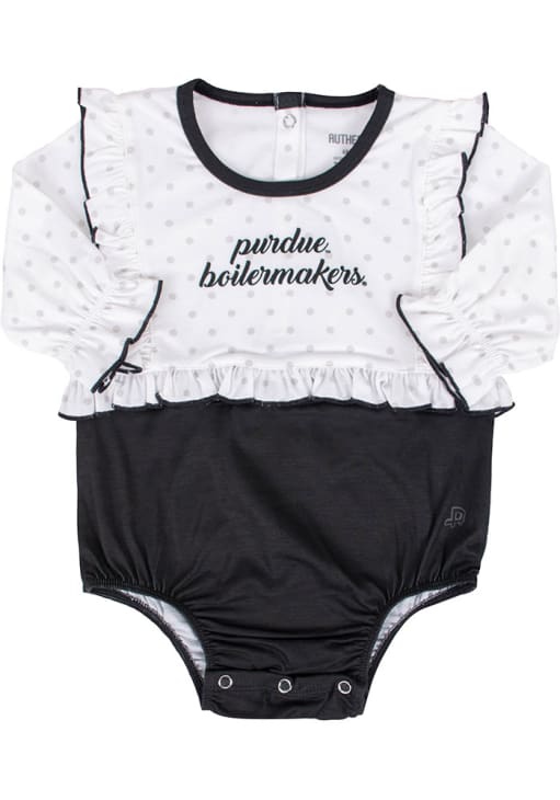Product Details Product Details Half back snap placketLong inset sleevesElastic sleeve cuff, body rufflesContrast rolled hemSelf-fabric binding on neck and leg openingStandard snap crotch95% polyester 5% spandexMachine Wash ColdImport, Domestic Officially Licensed Get ready for gameday with this Baby Blue Purdue Boilermakers Rene LS One Piece! Your little Boilermakers will be warm and cozy at the game.