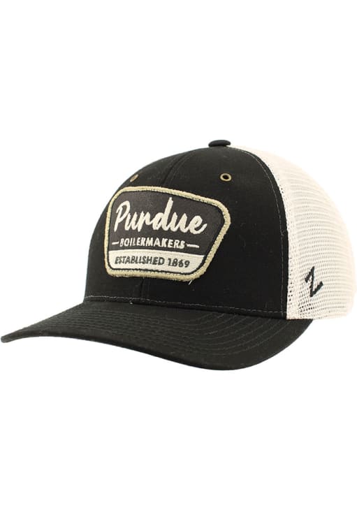Product Details Product Details Zephyr State Park HatFront sign-inspired patch logoMatching crown and visorContrast meshbackSide Z logoCotton/Poly BlendCurved BillLow CrownStructuredWipe clean with cloth or cleaning kitImported Officially Licensed This Black Boilermakers Adjustable Hat features a front embroidered team logo.