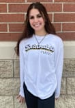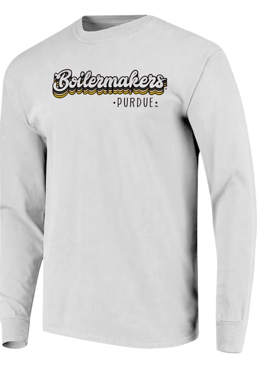 Show your Purdue Boilermakers spirit in this Purdue White T-Shirt! This Purdue Retro Stack Script Long Sleeve T-Shirt makes a great layer for cooler nights cheering on the Boilermakers. Featuring a screen print team graphic on center chest, this Purdue Boilermakers Long Sleeve LS Tee is an essential addition for every fan. Hail Purdue!