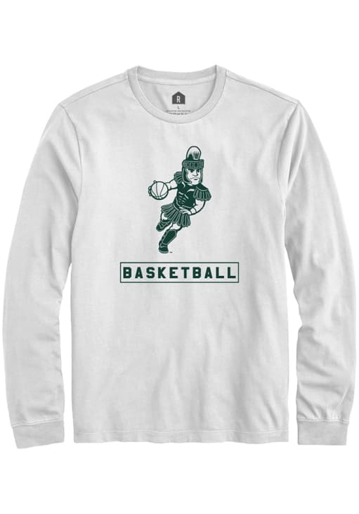 Show your Michigan State Spartans spirit in this MSU White T Shirt! This MSU Sparty Playing Basketball Long Sleeve T Shirt makes a great layer for cooler nights cheering on the Spartans. Featuring a screen print sport and mascot logo across chest, this Michigan State Spartans Long Sleeve Tee is an essential addition for every fan. Go Spartans!