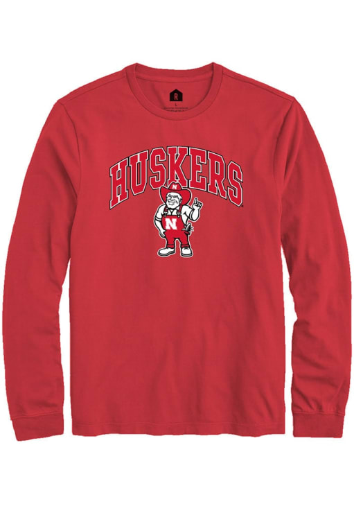 Show your Nebraska Cornhuskers spirit in this Nebraska Red T Shirt! This Nebraska Arched Mascot Long Sleeve T Shirt makes a great layer for cooler nights cheering on the Cornhuskers. Featuring a screen print of Nebraska over Herbie, this Nebraska Cornhuskers Long Sleeve Tee is an essential addition for every fan. Go Huskers!