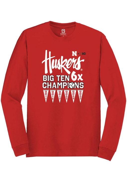 Show your Nebraska Cornhuskers spirit in this Nebraska Red T Shirt! This Nebraska Big Ten 6x Volleyball Champions Long Sleeve T Shirt makes a great layer for cooler nights cheering on the Cornhuskers. Featuring a screen printed graphic, this Nebraska Cornhuskers Long Sleeve Tee is an essential addition for every fan. Go Huskers!