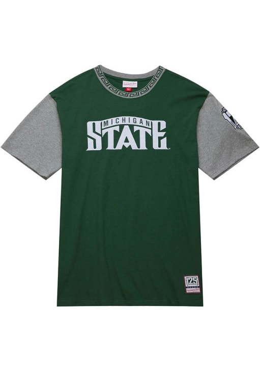 Display your team spirit with this remarkable Michigan State Spartans Green 125th Anniversary of Basketball Champ Era Short Sleeve T Shirt! The MSU Short Sleeve Tee showcases a screenprint team graphic across front chest, 125th logo on left sleeve, full back mascot and custom rib trim that truly sets it apart. Stand out from the crowd and proudly declare your allegiance to the Spartans with this exceptional Green MSU T Shirt. Go Spartans!