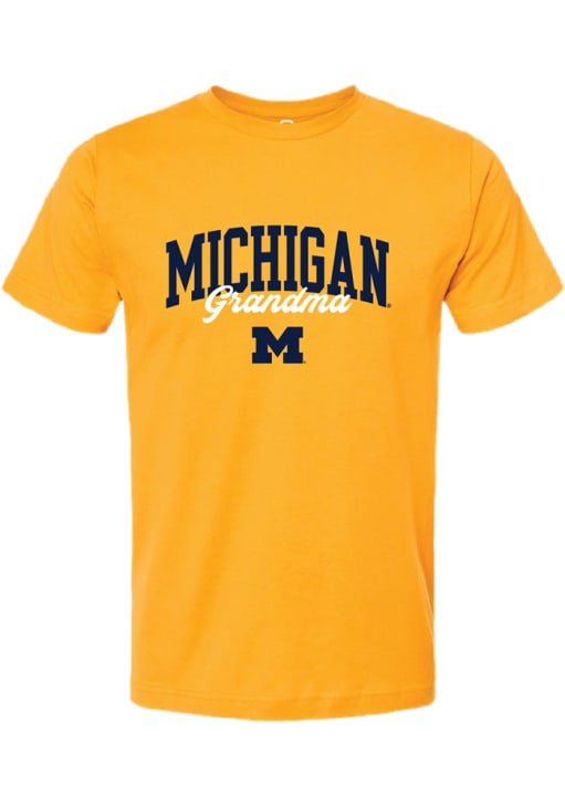 Display your team spirit with this remarkable Michigan Wolverines Gold Grandma Short Sleeve T-Shirt! The Michigan Short Sleeve Tee showcases a screen print team "grandma" graphic on center chest that truly sets it apart. Stand out from the crowd and proudly declare your allegiance to the Wolverines with this exceptional Gold Michigan T-Shirt. Go Michigan!