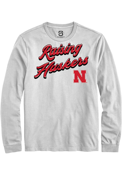 Show your Nebraska Cornhuskers spirit in this Nebraska White T Shirt! This Nebraska RAISING MASCOTS Long Sleeve T Shirt makes a great layer for cooler nights cheering on the Cornhuskers. Featuring a team graphic, this Nebraska Cornhuskers Long Sleeve Tee is an essential addition for every fan. Go Huskers!