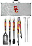 - Grill set includes: 4 skewers, spatula with bottle opener and serrated edge, fork and tongs