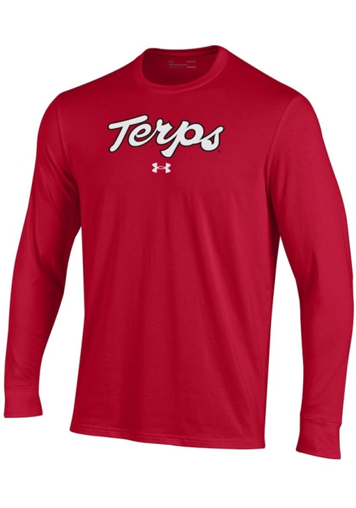 Show your Maryland Terrapins spirit in this Maryland Red T Shirt! This Maryland Performance Long Sleeve T Shirt makes a great layer for cooler nights cheering on the Terrapins. Featuring a screen print graphics, this Maryland Terrapins Long Sleeve Tee is an essential addition for every fan. Go Terps!