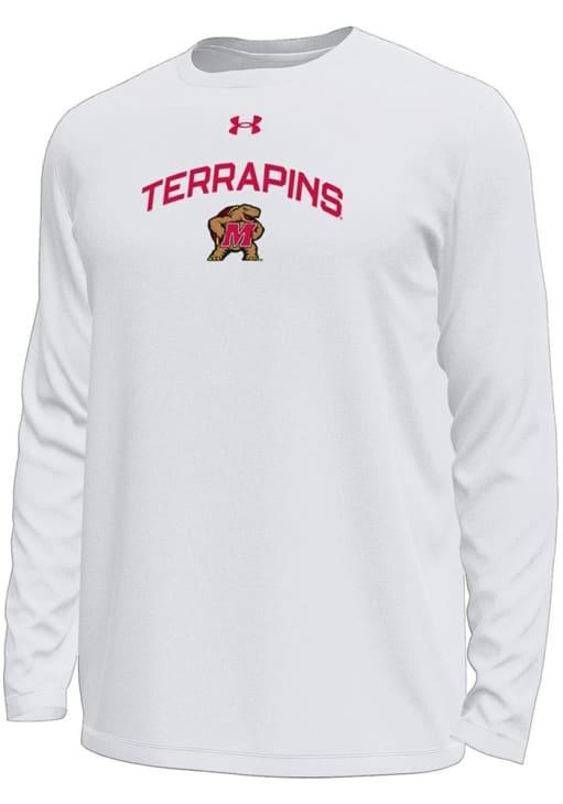Make a bold statement in this Maryland Terrapins White Arch Mascot Tech Stretch Long Sleeve T-Shirt! This Maryland Long Sleeve Tee features a team graphic on center chest. Go Terps!