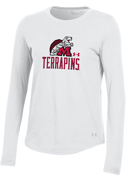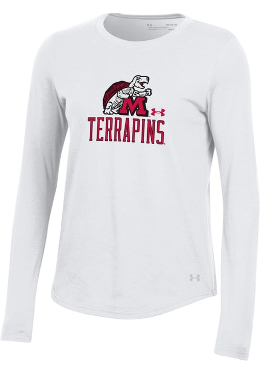 Show your Maryland Terrapins spirit in this Maryland White T-Shirt! This Maryland Rounded Number One Long Sleeve T-Shirt makes a great layer for cooler nights cheering on the Terrapins. Featuring a screen print team name and logo on center chest with team logo on center back, this Maryland Terrapins Long Sleeve LS Tee is an essential addition for every fan. Go Terps!
