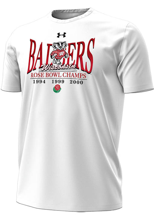 Display your team spirit with this remarkable Wisconsin Badgers White Mascot Rose Bowl Champs Short Sleeve T Shirt! The Wisconsin Short Sleeve Tee showcases a screen print team graphic on center chest that truly sets it apart. Stand out from the crowd and proudly declare your allegiance to the Badgers with this exceptional White Wisconsin T Shirt. Go Badgers!