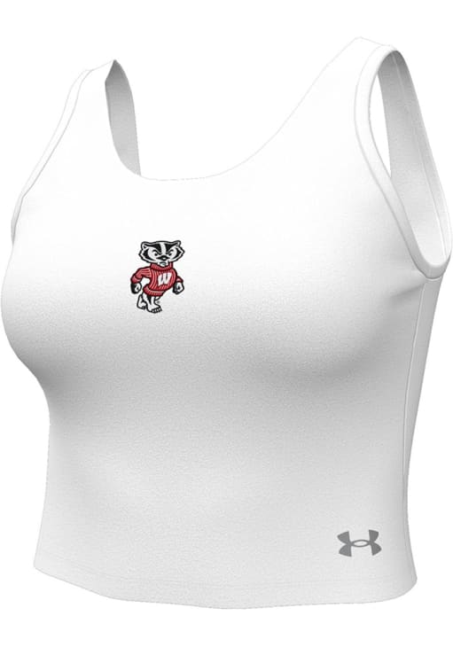 Elevate your tailgating style with this Wisconsin Badgers Womens Tank Top. Stay fashionable and comfortable in the refreshing White Motion Sleeveless Shirt. Discover the enticing details of this Wisconsin Tank Top, showcasing a screen print team graphic on center chest that's sure to impress.