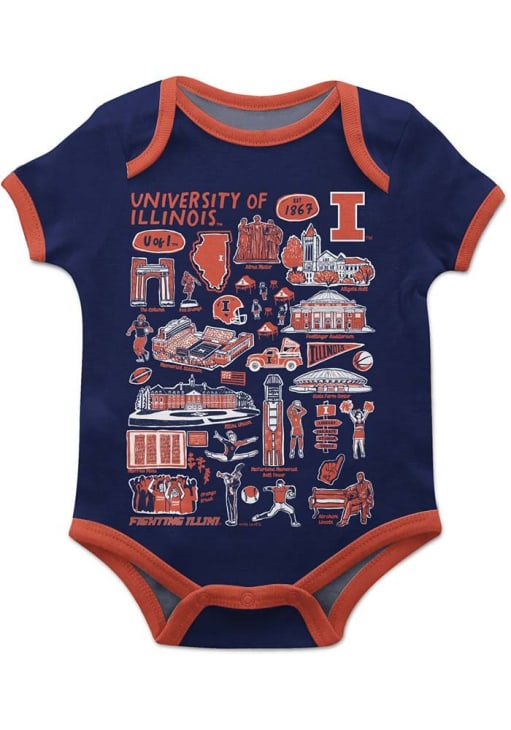 Your little Fighting Illini fan will look adorable in this Baby Navy Blue Illinois Fighting Illini Impressions One Piece! This Illinois Fighting Illini Romper features a hand sketched artwork perfect to keep the new fan cheering for your favorite team.
