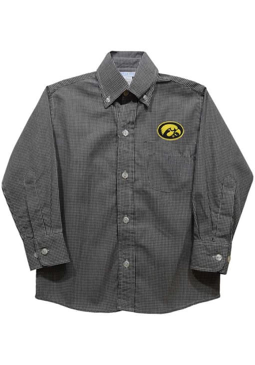 Product Details Product Details Embroidered school logo on chestLong sleeve with cuffsBack yoke with center pleat, button down collarPocket on left side and front button placketMini check print55% COTTON/45% POLYESTERMachine wash warm. Tumble dry, Cool iron. Do not bleach. Wash with like colors. Officially Licensed Style your little Hawkeyes fan in this Black Iowa Hawkeyes Long Sleeve Polo. This Gingham Polo features a embroidered team logo.