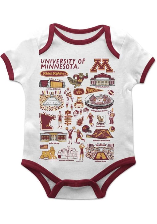 Your little Golden Gophers fan will look adorable in this Baby White Minnesota Golden Gophers Impressions One Piece! This Minnesota Golden Gophers Romper features a hand sketched artwork perfect to keep the new fan cheering for your favorite team.