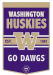 Product Details Product Details Measures: 24" W x 38" LEmbroidered with vibrant applique detailsStitched along entire borderDesigned with team name and logoImported Officially Licensed Washington Huskies Wool Banner is a great way to show off your Huskies spirit. This Banner features a team logo.