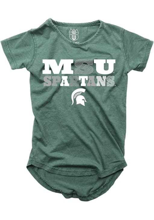 Show your support for Spartans in this Girls Green Michigan State Spartans Short Sleeve Fashion Tee! This Multi Font Fashion T-Shirt features a screenprint team graphic that pairs perfect with any wardrobe. Get ready to show pride for your favorite team as you cheer "Go Spartans"