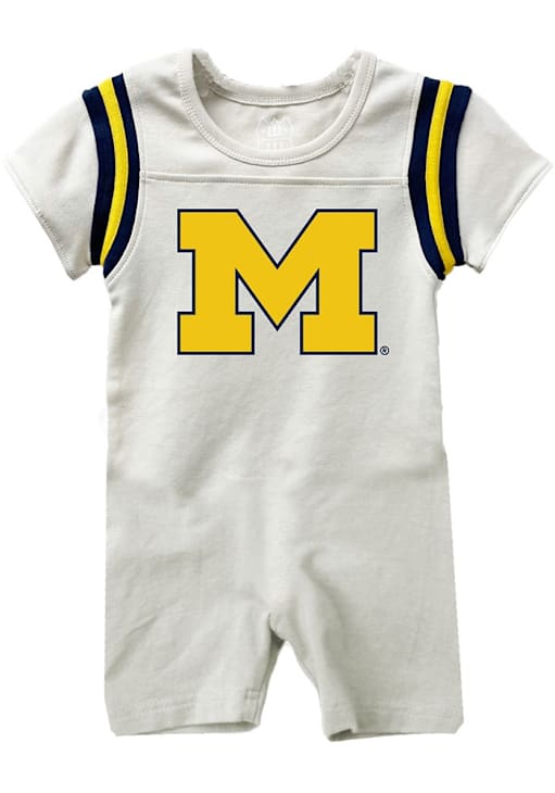 Product Details Product Details Screen print graphic center chestTeam color stripes on arm inset and sleeve cuffShort leg romper100% COTTONPerfect for any young sports fan!Officially licensed100% COTTONImport, Domestic Officially Licensed Your little Wolverines fan will look adorable in this Baby Blue Michigan Wolverines Romper One Piece! This Michigan Wolverines Romper features a screenprint team graphic.