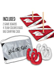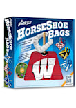 - Includes 2 all-wood game boards with 14" wood posts, 4 team-colored horseshoe bags, bag carrying case