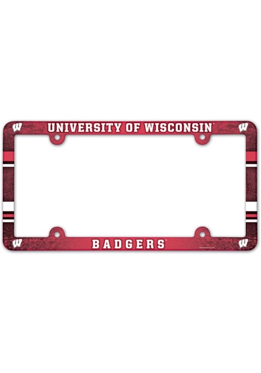 This Badgers License Plate Holder features a team color and team logo.
