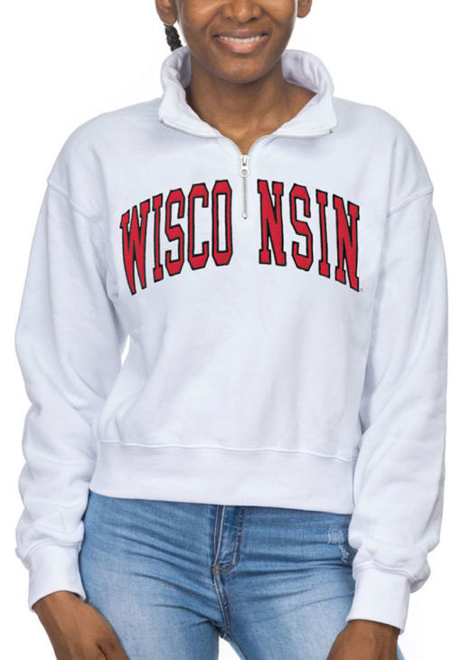 Embrace the warmth and showcase your Badgers pride with our Wisconsin Badgers Long Sleeve Qtr Zip. This Womens White Cropped Sport Fleece Long Sleeve Pullover offers a applique team name on center chest for the perfect combination of comfort and style. Elevate your everyday look with this must-have Wisconsin Badgers Long Sleeve Qtr Zip.