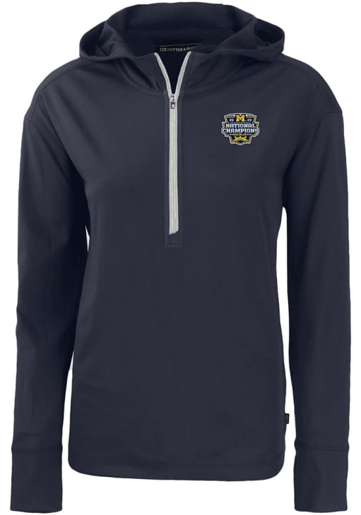 Embrace the warmth and showcase your Wolverines pride with our Michigan Wolverines Long Sleeve Qtr Zip. This Womens Blue 2023 College Football National Champions Daybreak Hood Long Sleeve Pullover offers a moisture wicking material for the perfect combination of comfort and style. Elevate your everyday look with this must-have Michigan Wolverines Long Sleeve Qtr Zip.