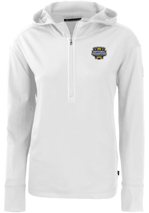 Embrace the warmth and showcase your Wolverines pride with our Michigan Wolverines Long Sleeve Qtr Zip. This Womens White 2023 College Football National Champions Daybreak Hood Long Sleeve Pullover offers a moisture wicking material for the perfect combination of comfort and style. Elevate your everyday look with this must-have Michigan Wolverines Long Sleeve Qtr Zip.