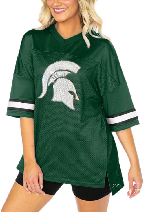 This remarkable Michigan State Spartans Womens Rookie Move Oversized Sequins Fashion Football Jersey, showcasing a seqiun applique team logo on center front. Elevate your admiration for Michigan State Spartans as you embrace this exceptional piece, designed to impress.
