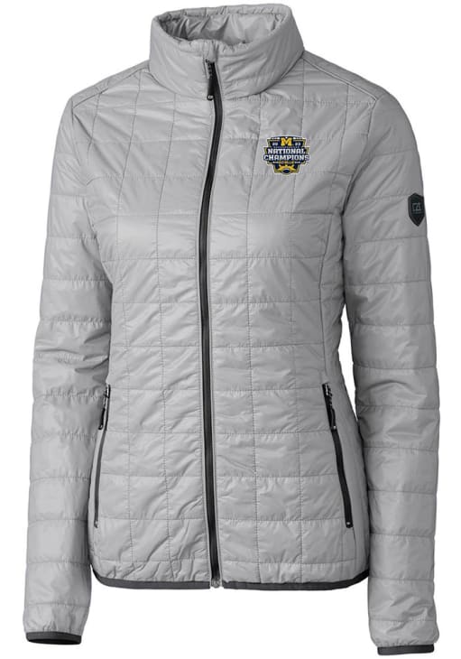 Stay cozy in this Michigan Wolverines Womens Grey 2023 College Football National Champions Rainier PrimaLoft Filled Jacket. This Wolverines Filled Coat is a great way to stay warm and show your Michigan spirit in even the coldest weather. Don't leave home without this Michigan Wolverines Filled Jacket, which features a recycled polyester insulation.