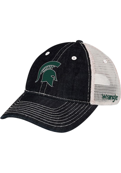 Product Details Product Details Wrangler Denim Trucker HatFront embroidered team logoStretch denim crown and visorContrast soft meshbackSide Wrangler logoCotton/Poly BlendCurved BillLow CrownUnstructuredWipe clean with cloth or cleaning kitImported Officially Licensed This Blue Spartans Adjustable Hat features a front embroidered team logo on a matching denim crown and visor with contrast meshback.