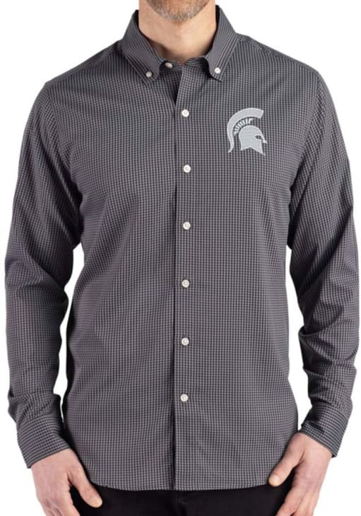 Mens Michigan State Spartans Black Cutter and Buck Gingham LS Woven Long Sleeve Dress Shirt