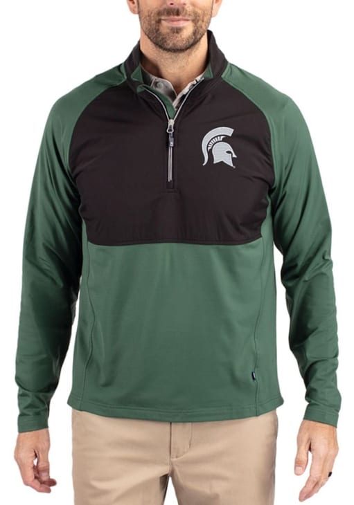 Embrace the warmth and showcase your Spartans pride with our Michigan State Spartans Long Sleeve Qtr Zip Pullover. This Mens Green Adapt Eco Hybrid Long Sleeve Pullover offers a wind resistant recycled shell for the perfect combination of comfort and style. Elevate your everyday look with this must-have Michigan State Spartans Long Sleeve Qtr Zip Pullover.