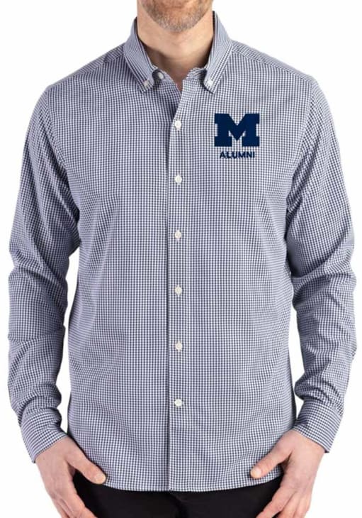 Show your Wolverines spirit show in the office with this Michigan Wolverines Dress Shirt! Embrace your team spirit and showcase it proudly in this Mens Navy Blue Alumni Gingham LS Woven Long Sleeve Long Sleeve Button Down Shirt. This Long Sleeve Dress Shirt features a team logo.