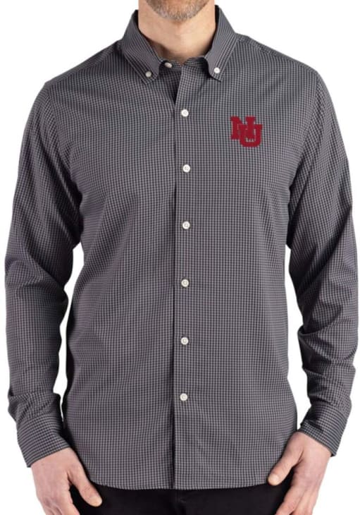 Mens Nebraska Cornhuskers Black Cutter and Buck Vault Gingham LS Woven Long Sleeve Dress Shirt