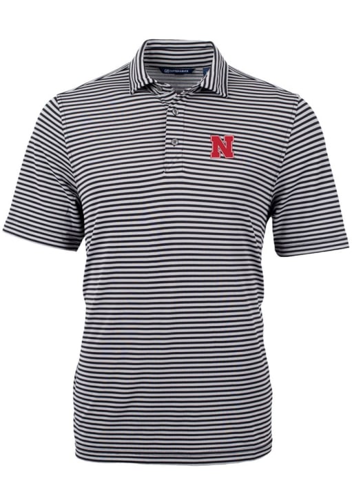 Mens Nebraska Cornhuskers Black Cutter and Buck Virtue Eco Pique Stripe Version Short Sleeve Polo..
