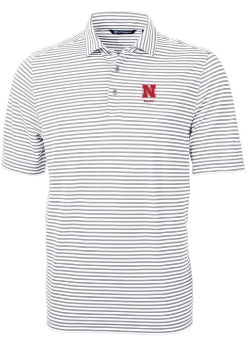 Mens Nebraska Cornhuskers Grey Cutter and Buck Alumni Virtue Eco Pique Stripe Short Sleeve Polo Sh..