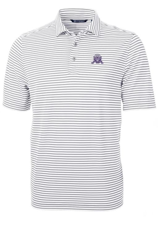 Mens Northwestern Wildcats Grey Cutter and Buck Vault Virtue Eco Pique Stripe Short Sleeve Polo Sh..