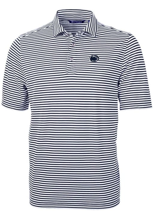 Mens Penn State Nittany Lions Navy Blue Cutter and Buck Virtue Eco Pique Stripe Short Sleeve Polo..