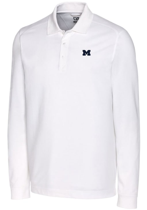 Make a bold statement in this Michigan Wolverines Cutter and Buck Mens White Advantage Pique Long Sleeve Long Sleeve Polo! This Polo features a high quality tri-blend pique that combines super soft cotton with DryTec polyester and spandex, making this Mens Long Sleeve Polo Shirt perfect for any Michigan fan who wants to display their spirit in any setting.