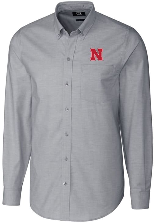 Mens Nebraska Cornhuskers Charcoal Cutter and Buck Stretch Oxford Long Sleeve Dress Shirt