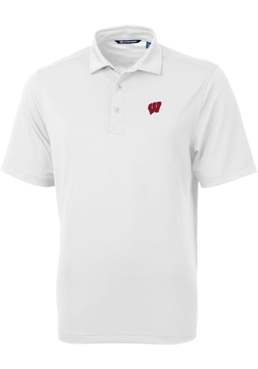 Mens Wisconsin Badgers White Cutter and Buck Virtue Eco Pique Short Sleeve Polo Shirt