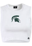 Elevate your tailgating style with this Michigan State Spartans Womens Tank Top. Stay fashionable and comfortable in the refreshing White Cut Off Sleeveless Shirt. Discover the enticing details of this MSU Tank Top, showcasing a screen print team logo on center chest that's sure to impress.