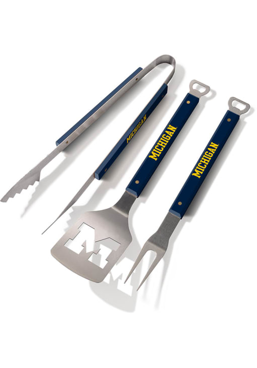 Product Details Product Details Includes Sportula, tongs, and a grill forkUnique laser-cut designHard maple handles with durable brass rivetsConvenient integrated bottle openerDimensions: 22" x 9"Stainless Steel Officially Licensed This Michigan Wolverines Tool Set is a great way to show your Wolverines pride while grilling at the tailgate. This Tool Set features a Sportula, a pair of tongs and a grill fork.