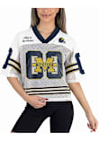 This remarkable Michigan Wolverines Womens Trailblazer Fashion Football Jersey, showcasing a screenprint team name and team logo on center chest with embriodered team name on right shoulder and team logo on left shoulder and faux leather numbers on both sleeves. Elevate your admiration for Michigan Wolverines as you embrace this exceptional piece, designed to impress.