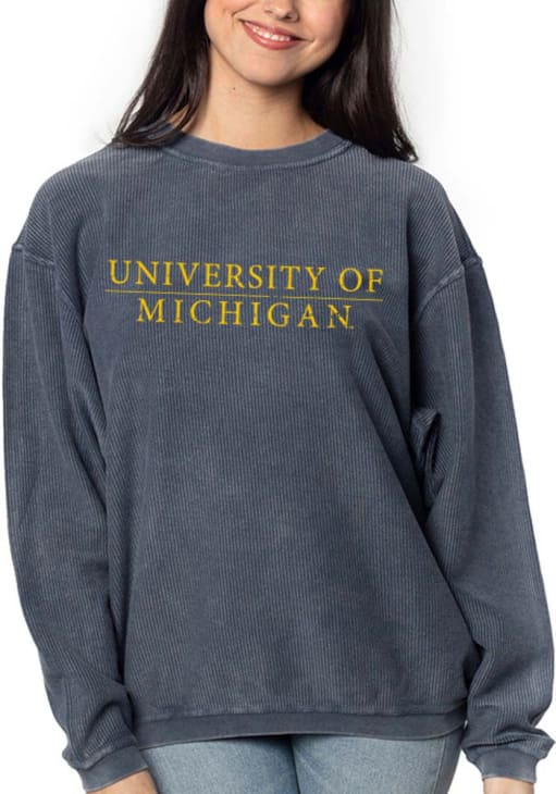 Gear up for the ultimate game day experience with this remarkable Michigan WolverinesWomens Blue Corded Crew Sweatshirt! Designed with the true fan in mind, this Wolverines Long Sleeve Sweatshirt features a screen print team name on center chest. Stay warm and comfortable with this Womens Michigan Wolverines Crew Sweatshirt.