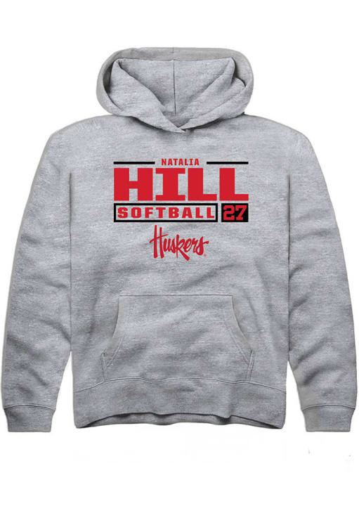 Natalia Hill Rally Youth Grey Nebraska Cornhuskers NIL Stacked Box Long Sleeve Hooded Sweatshirt