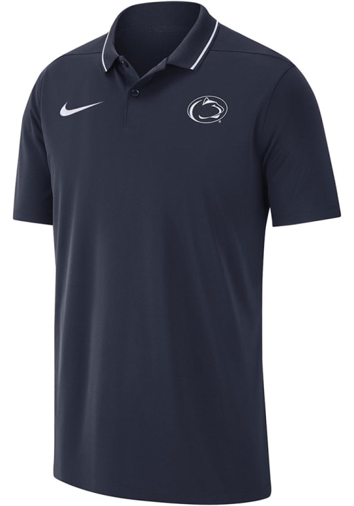 Enhance your professional style with this striking Mens Navy Blue Short Sleeve Polo Shirt! Showcase your team pride among colleagues with this exceptional Penn State Navy Blue DriFIT Coach Short Sleeve Polo. Stand out and make a statement in this Penn State Nittany Lions Short Sleeve Polo, featuring a embroidered team logo on left chest with Nike swoosh on right that adds a touch of distinction to your look.