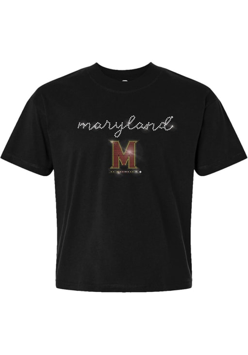 Display your team spirit with this remarkable Maryland Terrapins Black Rhinestone Script Short Sleeve T-Shirt! The Maryland Short Sleeve Tee showcases a rhinestone team name on center chest that truly sets it apart. Stand out from the crowd and proudly declare your allegiance to the Terrapins with this exceptional Black Maryland T-Shirt. Go Terps!