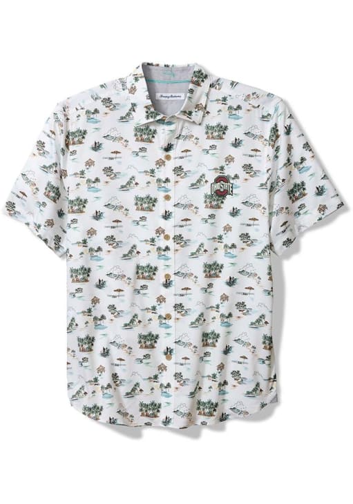 Mens Ohio State Buckeyes White Tommy Bahama Surf Villa Camp Short Sleeve Dress Shirt